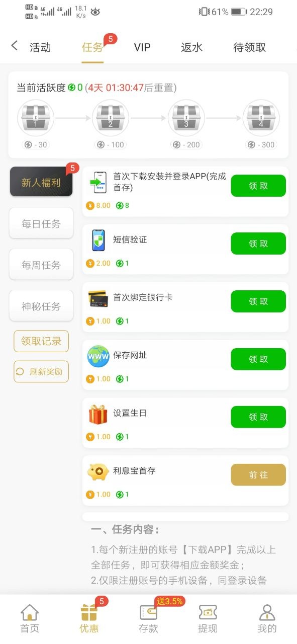 优惠→任务→自助领取13彩金