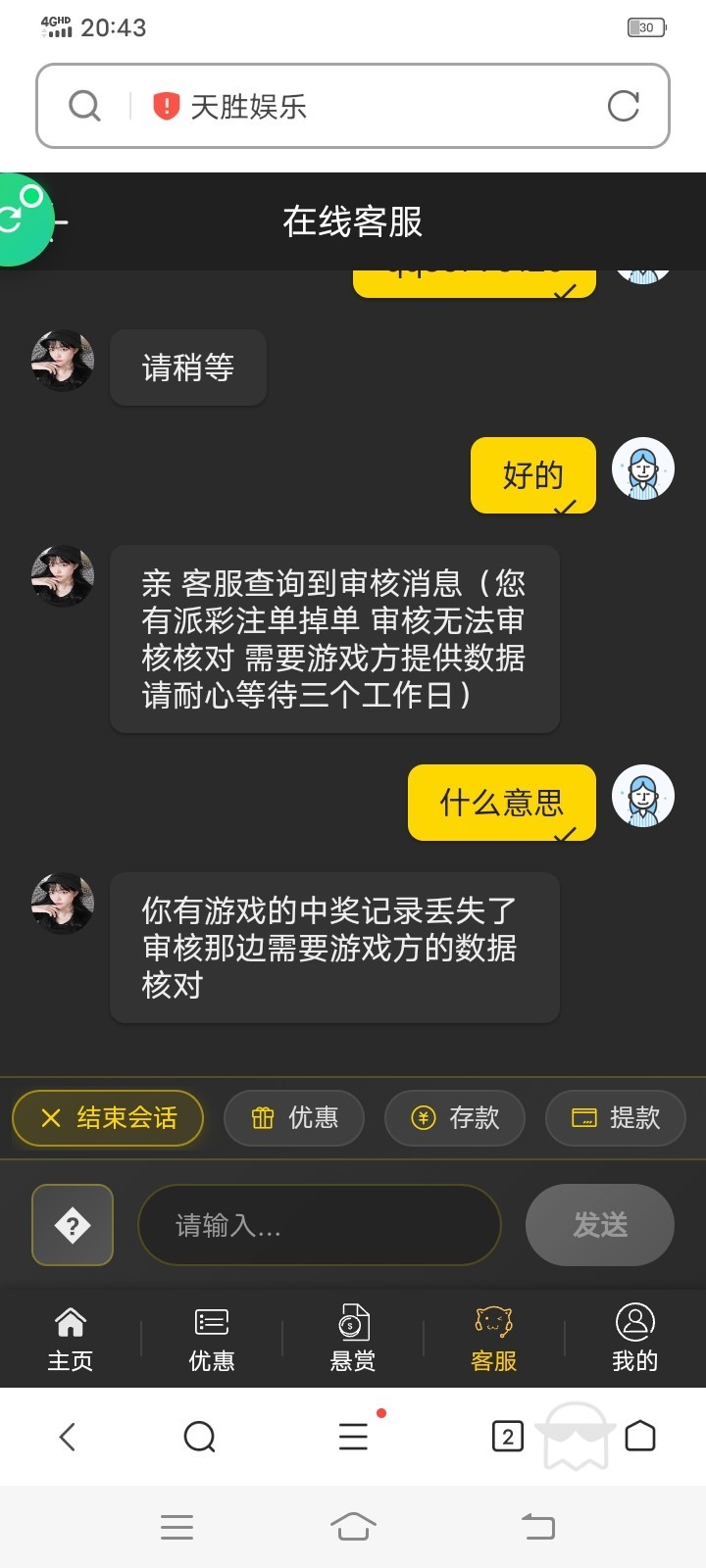 天胜娱乐是刚才位赌友发的说他领免费红包出款100我就充值100赢900最后提510退回来理由说中奖记录不见要查询时间还要等3天是黑了吧
