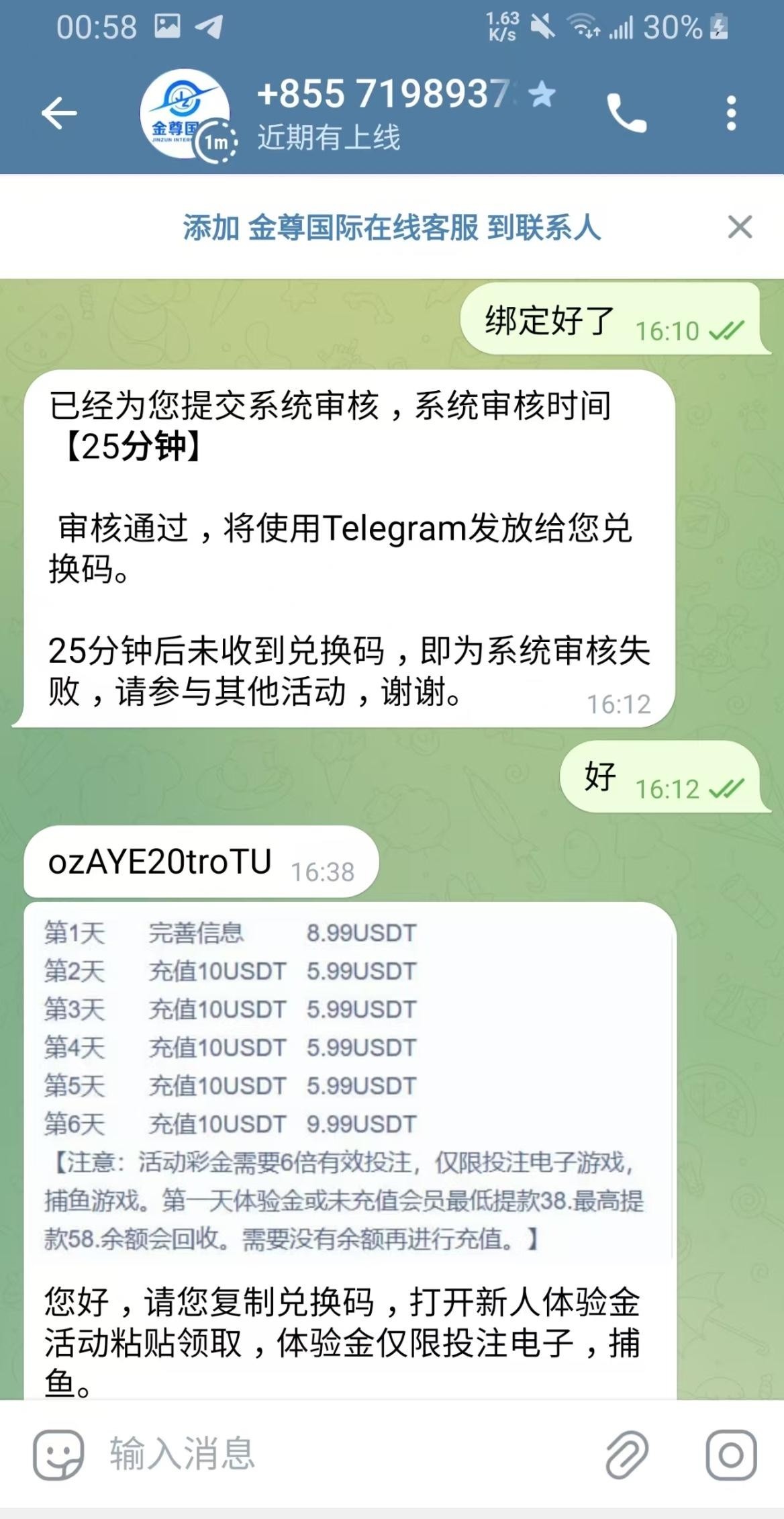 有汇旺的去,绑定手机号和汇旺,汇旺不需要流水。联系飞机客服@JinZunKF 申请。审核通过了会给你一个兑换码。就说在一个频道看到的广告,但是现在看不到了。我领到了没有打出来,请勿充值